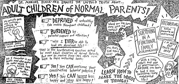 Too many people worry that their family isn’t normal. In all my years as a family therapist, I’ve alleviated the concerns of many families: Don’t worry about it. Don’t try to be “normal.” Don’t waste time comparing to others. Just work on being kind, being there for each other, working on your patience, and you’ll do just fine. In the meantime, enjoy these cartoons I used to share in my live workshops to illustrate this point:
